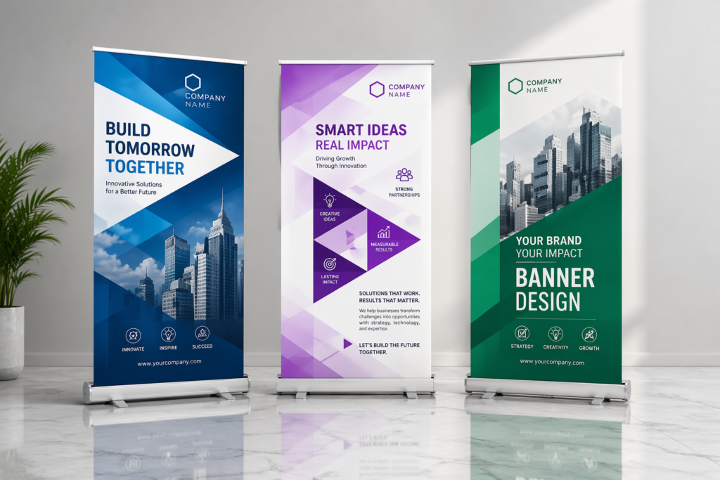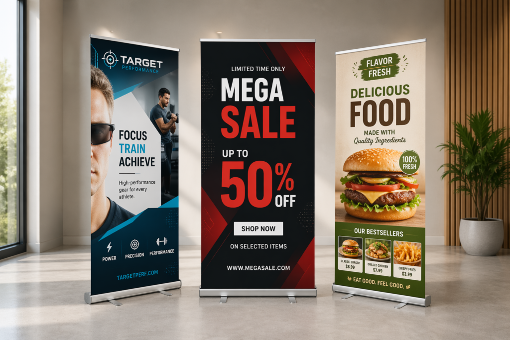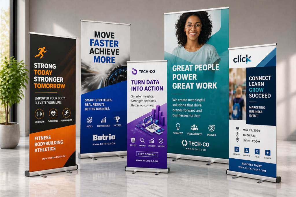 We print a wide range of banners including PVC flex, fabric, mesh, backlit, roll-up, and pop-up banners, suitable for indoor and outdoor promotions, exhibitions, and corporate branding.
