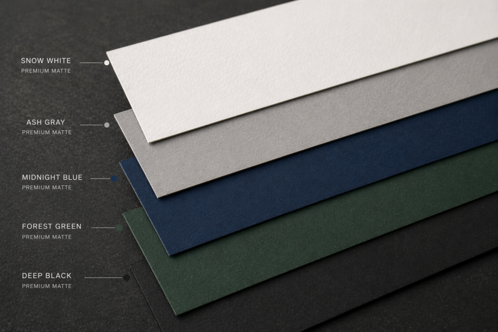 Choose from a wide range of card stocks including special card, texture material, matte, gloss, silk, velvet touch, kraft, linen, plastic, PVC, and metal finishes